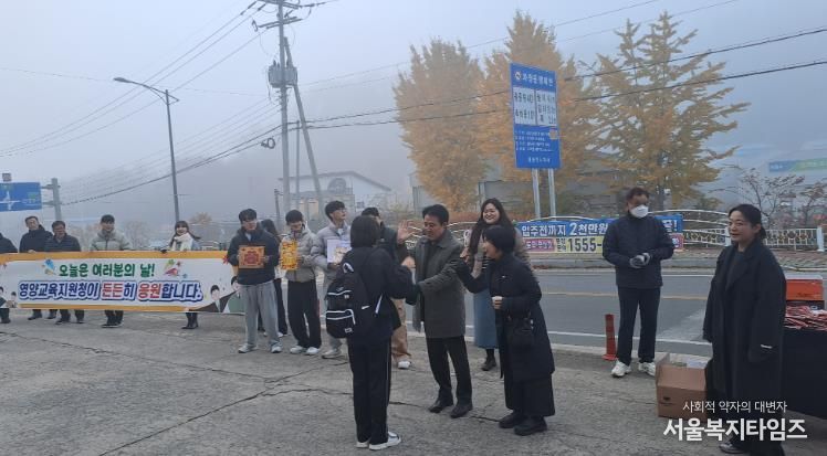 서울복지타임즈 이재연 기자 | 경상북도영양교육지원청은 2025년 11월 13일 오전 7시 10분부터 영양여자중·고등학교 정문에서 2026학년도 대학수학능력시험에 응시하는 수험생을 대상으로 수험생 응원 행사를 진행했다.