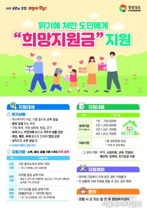 희망지원금은 올해 처음 경남도가 현행 법·제도에서 제외된 저소득 가구 중 위기상황에 처한 가구에 생계비, 의료비 등을 지원받을 수 있도록 도입한 경남형 긴급복지 제도이다.