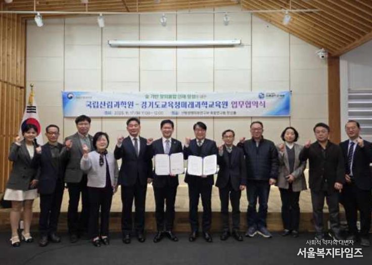 서울복지타임즈 이재연 기자 | 산림청 국립산림과학원은 17일, 수원특례시 산림생명자원연구부에서 경기도교육청미래과학교육원과 ‘숲기반 창의융합형 인재 양성’을 위한 업무협약(MOU)을 체결했다고 밝혔다.