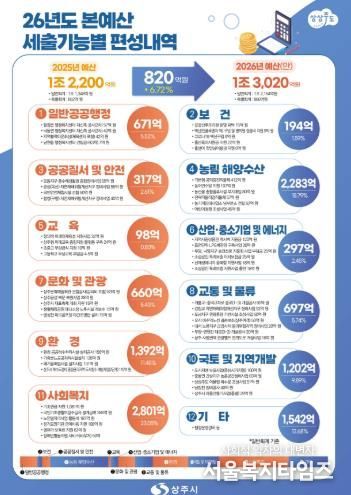 서울복지타임즈 이재연 기자 | 상주시는 2026년 상주시의 살림을 위한 본예산안 규모를 총 1조 3,020억 원으로 편성해 11월 20일 상주시의회에 제출했다.