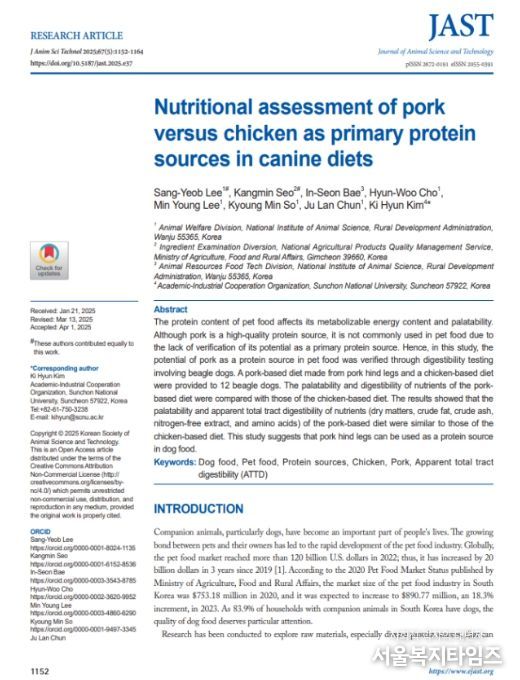 서울복지타임즈 이재연 기자 | 농촌진흥청은 국내산 돼지고기 뒷다리살이 반려견 사료의 단백질 공급원으로 활용될 수 있는지 평가한 결과, 영양적 품질과 기호성 면에서 닭고기 기반 사료와 유사한 수준을 보였다고 밝혔다.