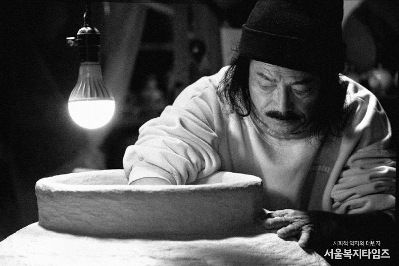 그는 인위적 장식이나 완벽을 거부하고, 자연과 인간이 공존하는 흔적 그대로를 쫒아 우주의 잔영을 흙 속에 남긴다.