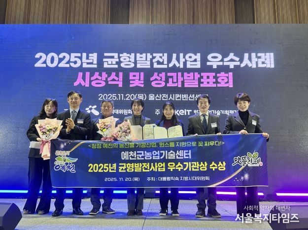 서울복지타임즈 이재연 기자 | 예천군은 20일, 지방시대위원회가 주최로 울산컨벤션센터에서 열린 ‘2025년 균형발전사업 우수사례 시상식’에서 예천군농산물가공기술지원센터가 지원계정 분야 우수사례로 선정되는 수상의 영광을 안았다고 밝혔다.