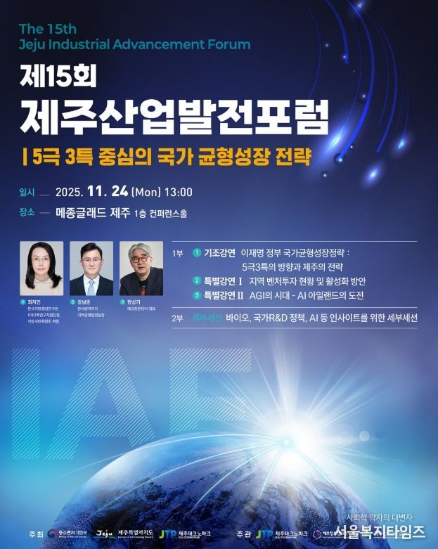 서울복지타임즈 이재연 기자 | 제주테크노파크(원장 지영흔, 제주TP)는 오는 24일 메종글래드 제주 1층 컨퍼런스홀에서 ‘5극 3특 중심의 국가 균형성장 전략’을 주제로 제15회 제주산업발전포럼을 개최한다.
