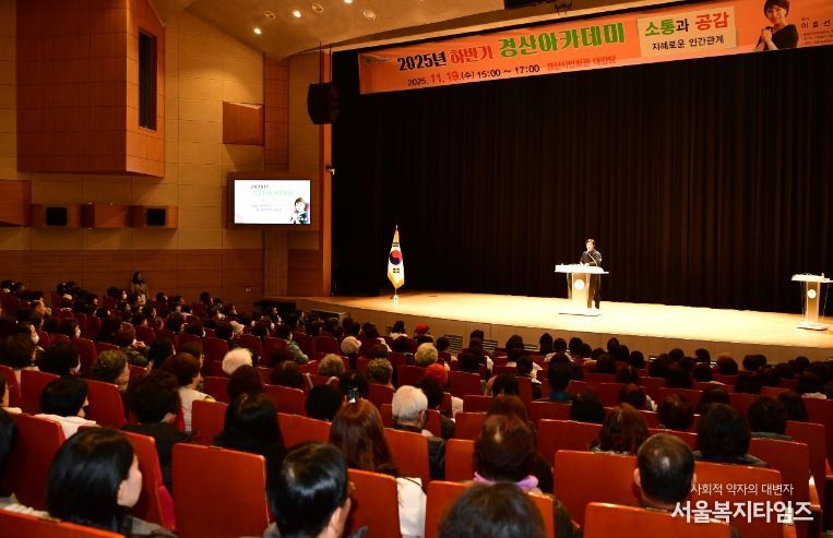 서울복지타임즈 이재연 기자 | 경산시는 19일 경산시민회관 대강당에서 시민 600여 명이 참여한 가운데 『2025년 하반기 경산 아카데미』를 성황리에 개최했다. 이번 경산 아카데미는 숭실사이버대학교 학과장 이호선 교수를 초청하여‘소통과 공감, 지혜로운 인간관계’라는 주제로 진행됐다.