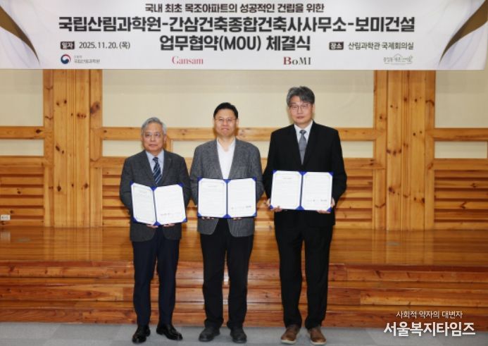 서울복지타임즈 이재연 기자 | 산림청 국립산림과학원은 20일, 간삼건축종합건축사사무소, 보미건설과 함께 국내 최초 목조아파트 건립을 위한 업무협약을 체결했다고 밝혔다.
