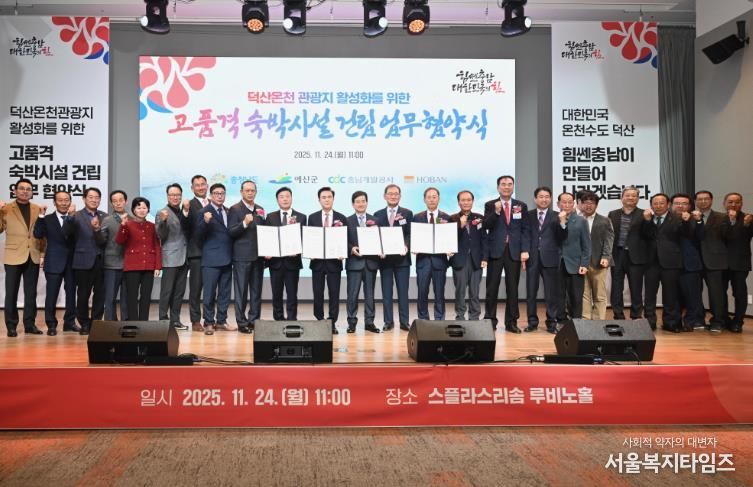 서울복지타임즈 이재연 기자 | 예산군은 24일 충청남도, 충남개발공사, ㈜호반호텔앤리조트와 함께 덕산온천관광지에 고품격 숙박시설 및 컨벤션 기능을 갖춘 복합 휴양시설 건립을 위한 업무협약(MOU)을 체결했다.