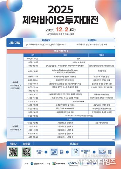 서울복지타임즈 이재연 기자 | 인천광역시가 주최하고 인천관광공사와 KOTRA, 한국제약바이오협회가 공동 주관하는 ‘제약바이오투자대전’이 오는 12월 2일 인천 송도컨벤시아 프리미어볼룸에서 열린다.
