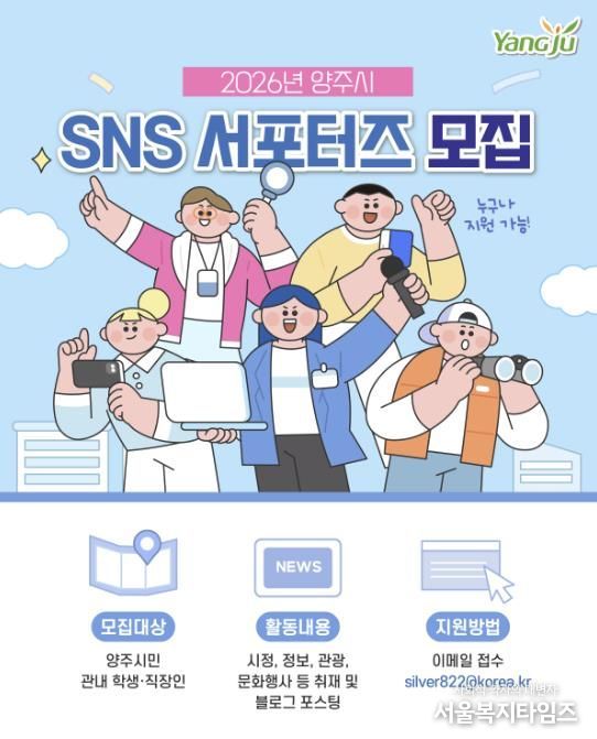 서울복지타임즈 이재연 기자 | 양주시가 시민과 소통하며 시정 소식과 지역의 숨은 매력을 널리 알릴 '2026년 양주시 SNS 서포터즈'를 오는 12월 1일부터 10일까지 10일간 모집한다.