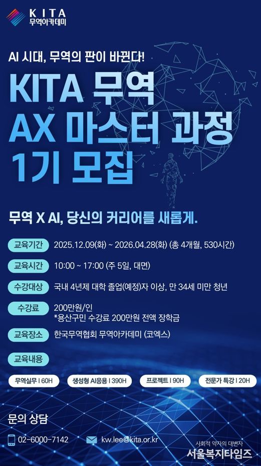 지원 대상은 용산구에 주소를 둔 만 34세 미만 청년으로, 국내 4년제 대학 졸업(예정)자 이상이다. 교육 신청 기간은 12월 2일까지이며, 한국무역협회 무역아카데미 누리집을 통해 접수하면 된다.