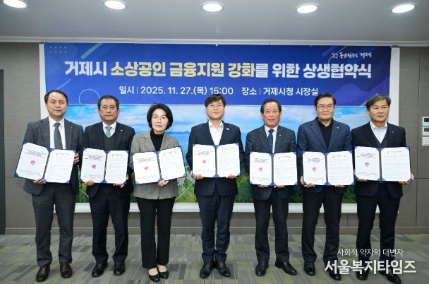 서울복지타임즈 이재연 기자 | 거제시는 27일 거제시청 시장실에서 관내 소상공인의 금융 지원 강화와 지역 경제 활성화를 위해 지류 거제사랑상품권 판매대행, 소상공인 육성자금, 저신용 소상공인 이차보전 지원사업 업무협약을 체결했다.