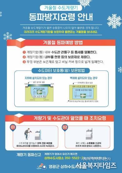 서울복지타임즈 이재연 기자 | 영광군 상하수도사업소에서는 수도시설 동파로 인한 주민불편 예방을 위해 겨울철 수도시설 동파 방지 대책 계획을 수립하고 수용가를 대상으로 수도계량기함과 옥내 급수관 보온조치 등 겨울철 수도계량기 동파방지를 위해 홍보하고 있다.