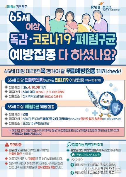 서울복지타임즈 이재연 기자 | 파주시는 겨울철 호흡기 감염병 확산에 대비해 65세 이상 어르신을 대상으로 독감(인플루엔자), 코로나19, 폐렴구균 예방접종 3종을 안내하며 접종 참여를 당부했다.