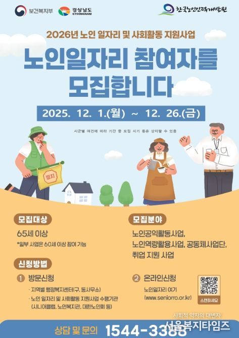 서울복지타임즈 이재연 기자 | 경상남도는 어르신의 활기차고 건강한 노후생활을 위해 ‘2026년 노인일자리 및 사회활동 지원사업’ 참여자를 모집하고 있다고 밝혔다.