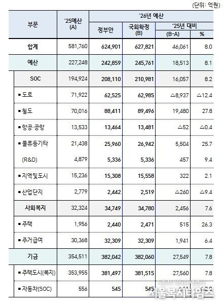 서울복지타임즈 이재연 기자 | 국토교통부는 12월 2일 국회 본회의 의결을 거쳐 ‘26년 국토부 예산이 62.8조원으로 최종 확정됐다고 밝혔다.