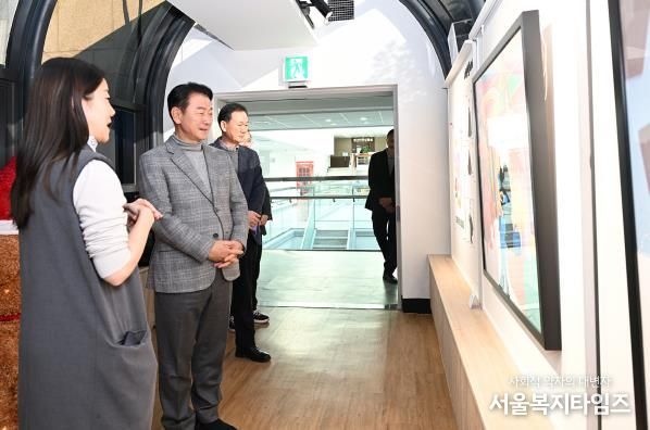 이날 김동근 시장은 본관 1층 로비에서 담은캘리그라피의 ‘영화 속 명대사(한글의 아름다움)’ 전시를 감상한 뒤, 연결통로로 이동해 ‘같이 걷는 발걸음’의 최소라 작가를 격려하고, 전시 공간 운영 방향에 대한 의견을 청취했다.