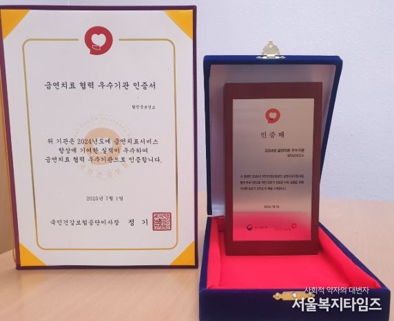 서울복지타임즈 이재연 기자 | 함안군보건소는 국민건강보험공단이 주관한 2025년 금연치료지원사업 평가에서 ‘금연치료 협력 우수기관’에 선정돼 인증서와 인증패를 받았다.