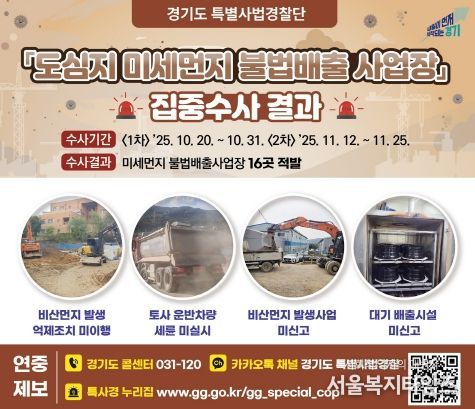 서울복지타임즈 이재연 기자 | 경기도는 도심지 미세먼지 발생사업장 330개를 대상으로 불법 배출 행위를 집중 수사해 대기환경보전법 위반 사업장 16개를 적발했다고 9일 밝혔다.