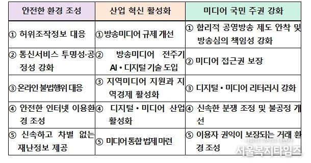 3대 분야는 ▲안전한 방송미디어통신 환경 조성 ▲규제와 진흥의 조화를 통한 산업혁신 활성화 ▲미디어 국민주권 강화이다.