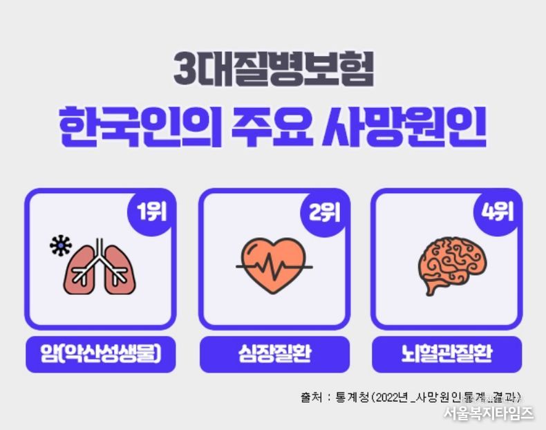 서울복지타임즈 이재연 기자 | 흔히 3대질병이라 일컫는 암, 심혈관질환, 뇌혈관질환은 통계청 발표자료에 따르면 한국인의 주요 사망원인 중에서 3위 폐렴을 제외하고 1~4위를 차지하고 있으며, 이전부터 지금까지도 살면서 가장 먼저 대비해야 하는 치명적인 질병으로 강조되고 있다. 이러한 중대질병에 대비하기 위하여 상기 세가지 치명적인 질병을 집중보장하는 3대질병진단비보험을 많이 가입하고 있다. 3대진단비보험은 각각의 질병을 중점적으로 보장하면서도 가입자 특성에 맞는 특약을 추가함으로써 종합건강보험으로도 활용할 수가 있다.