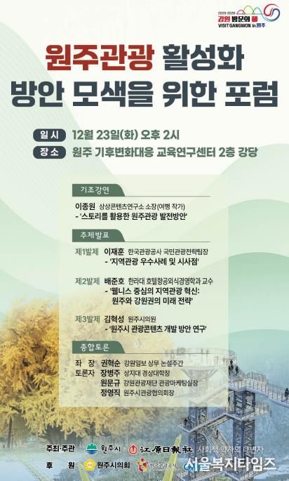서울복지타임즈 이재연 기자 | 원주시는 오는 23일 오후 2시, 기후변화대응교육연구센터 2층 대강당에서 ‘원주관광 활성화 방안 모색을 위한 포럼’을 개최한다.