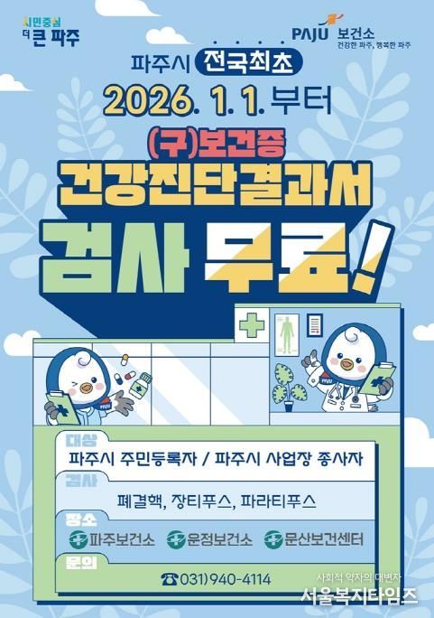 서울복지타임즈 이재연 기자 | 파주시가 시민들의 보건 의료 접근성을 획기적으로 높이고 지역사회 감염병 예방에 앞장서기 위해 전국 지방자치단체 최초로 건강진단결과서(구 보건증) 발급 수수료를 전면 무료화한다.