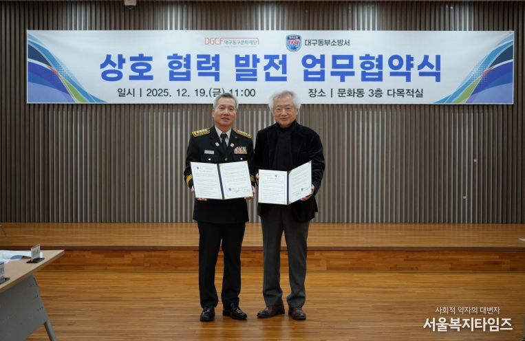 서울복지타임즈 이재연 기자 | (재)대구광역시동구문화재단(이사장 윤석준)과 대구동부소방서가 지난 12월 19일, 지역 문화시설의 안전관리 강화와 재난 대응 협력 구축을 위한 업무협약(MOU)을 체결했다.