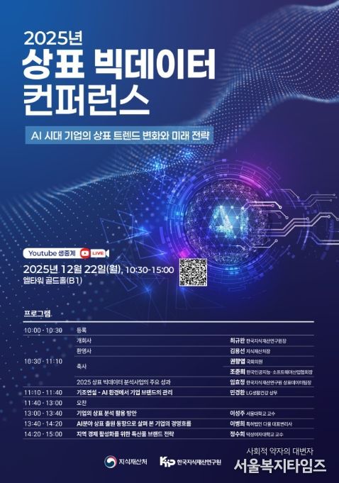 서울복지타임즈 이재연 기자 | 지식재산처가 주최하고 한국지식재산연구원이 주관하는 ‘2025년 상표 빅데이터 학술회의’가 12월 22일 10시 30분 엘타워 골드홀(서울 서초구)에서 개최된다.