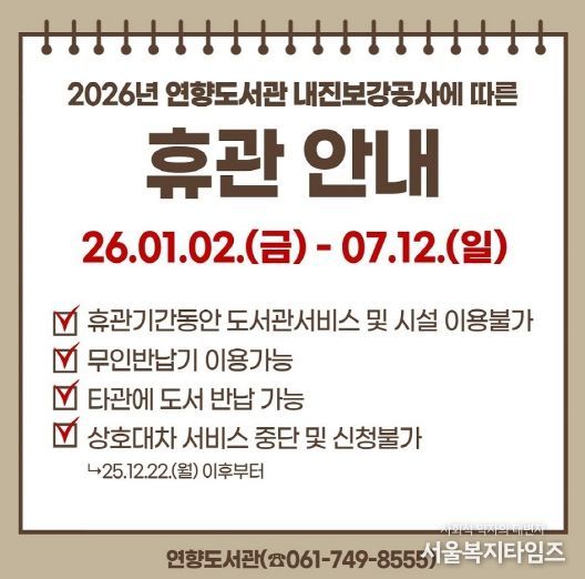 서울복지타임즈 이재연 기자 | 순천시는 연향도서관의 지진 대응 능력을 강화하고 시민들에게 안전한 독서 환경을 제공하기 위해 내년 상반기 내진성능 보강공사를 실시한다고 밝혔다.