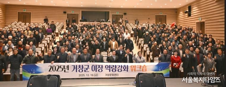 서울복지타임즈 이재연 기자 | 거창군은 지난 19일 거창문화센터 공연장에서 구인모 군수, 신성범 국회의원, 이재운 군의회 의장, 박주언 문화복지위원장, 김일수 도의원, 군의원, 거창군 이장, 담당 공무원 등 300여 명이 참석한 가운데 ‘2025년 거창군 이장 역량강화 워크숍’을 성황리에 개최했다고 밝혔다.