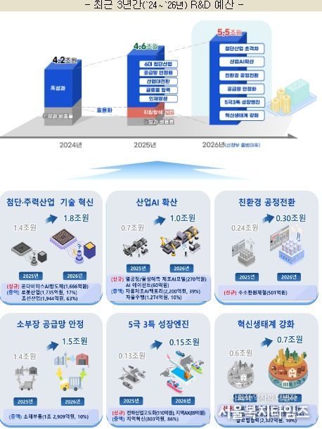 산업부는 ’25년대비 18% 증액된 역대 최대규모인 총 5.5조원을 지원하며, 신규 지원과제는 ’25년대비 85% 증가한 1.4조원을 투자한다. 지원 분야별로는 ▲반도체·이차전지·바이오·미래차·로봇·조선 등 첨단·주력산업 기술혁신에 1조 8,325억원(증액28%), ▲AI팩토리, 피지컬AI 등 산업 AI 확산 기술(M.AX)에 1조 455억원(증액52%), ▲수소환원제철 등 친환경 공정전환 기술에 2,990억원(증액24%), ▲경제안보를 위한 소부장 공급망 안정화에 1조 4,914억원(증액7%), ▲지역전략산업 육성 등 5극3특 성장엔진에 1,528억원(증액14%), ▲우수인재양성, 글로벌 협력 등 혁신생태계 강화에 7,040억원(증액16%)을 지원한다.