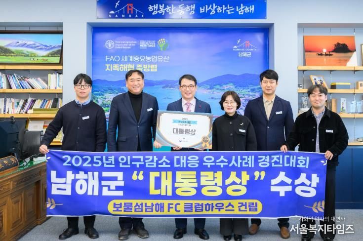 서울복지타임즈 이재연 기자 | 남해군이 행정안전부가 주관한 ‘2025년 지자체 인구감소 대응 우수사례 경진대회’에서 최고 우수 기초지자체로 선정돼 대통령상을 수상하는 영예를 안았다.