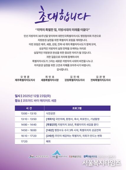 서울복지타임즈 이재연 기자 | 강원특별자치도는 12월 23일 코트야드 바이 메리어트 세종에서 강원, 제주, 세종, 전북 4개 특별자치시도지사들이 모여 대한민국특별자치시도 행정협의회 두 번째 정기회의를 개최했다.