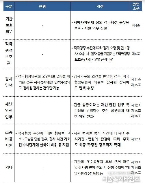 적극행정 추진으로 징계 소명 및 민·형사상 소송이 진행되는 경우 소속기관 차원의 보호·지원이 의무화되고, 적극행정 보호관을 지정해 공무원을 보호해야 한다.