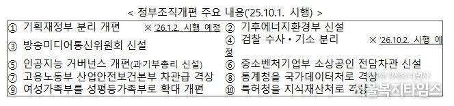 먼저, 정부조직개편은 특정 부처에 집중된 기능과 권한을 재배치하고, 기후 변화, AI 대전환 등 미래 위기에 선제적으로 대응하기 위해 기획재정부 분리 개편, 기후에너지환경부 신설 등을 중심으로 추진했다.