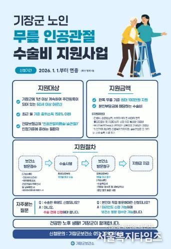 서울복지타임즈 이재연 기자 | 기장군은 오는 2026년부터 부산시 최초로 ‘어르신 무릎인공관절 수술비 지원사업’을 확대 시행한다고 23일 밝혔다.