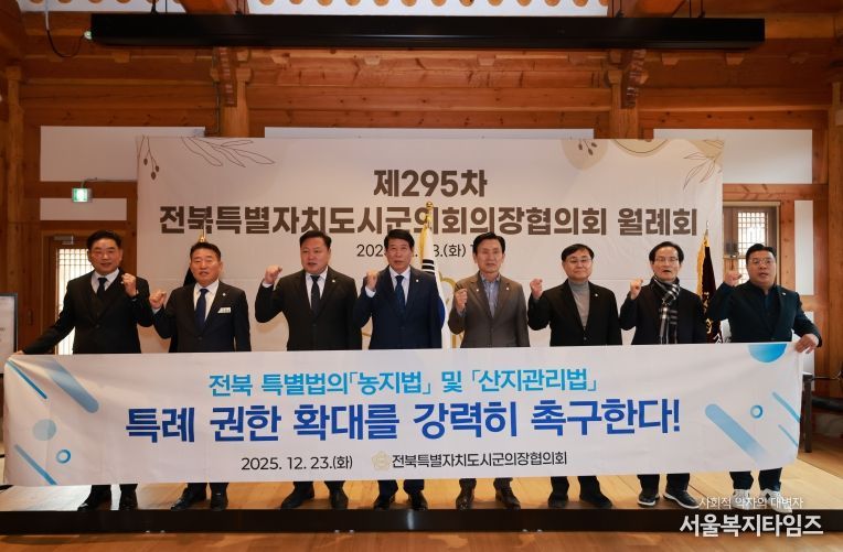 서울복지타임즈 이재연 기자 | 지난 23일 무주 태권도원에서 열린 전북특별자치도 시군의회의장협의회(회장 남관우 전주시의회 의장) 월례회에서 손종석 순창군의회 의장이 건의한 전북특별법 핵심 특례인 '농지법'과 '산지관리법'의 실효성 확보를 위한 권한 확대를 촉구하는 건의안이 채택됐다.