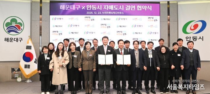 서울복지타임즈 이재연 기자 | 해운대구는 12월 23일, 부산 누리마루 APEC하우스에서 경상북도 안동시(시장 권기창)와 자매결연 협약을 체결했다.