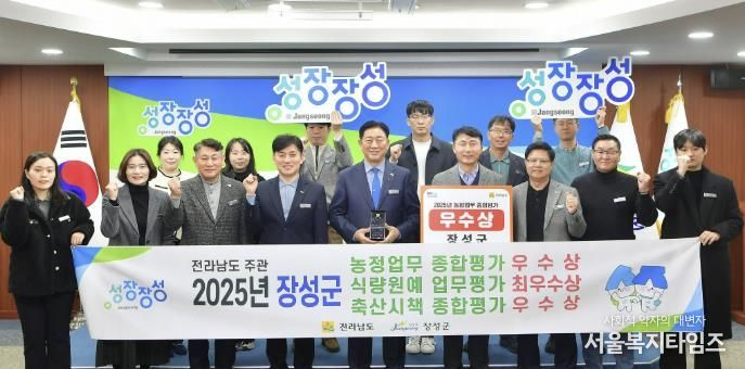 서울복지타임즈 이재연 기자 | 장성군이 최근 전라남도 농정업무 종합평가에서 종합 우수상을 수상했다. 식량·원예분야 최우수상, 농식품유통 우수상, 축산분야 우수상도 받았다.