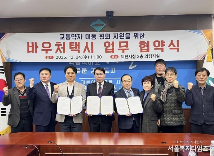 서울복지타임즈 이재연 기자 | 제천시는 지난 24일 교통약자의 이동권 보장과 이동 편의 증진을 위해 청풍호콜센터, ㈜티머니 모빌리티와 바우처택시 업무협약을 체결했다.