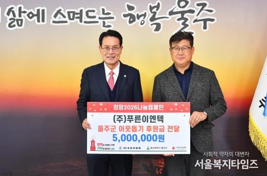 서울복지타임즈 이재연 기자 | ㈜푸른이엔텍이 26일 울주군에 지역 저소득층을 돕기 위한 성금 500만원을 전달했다.