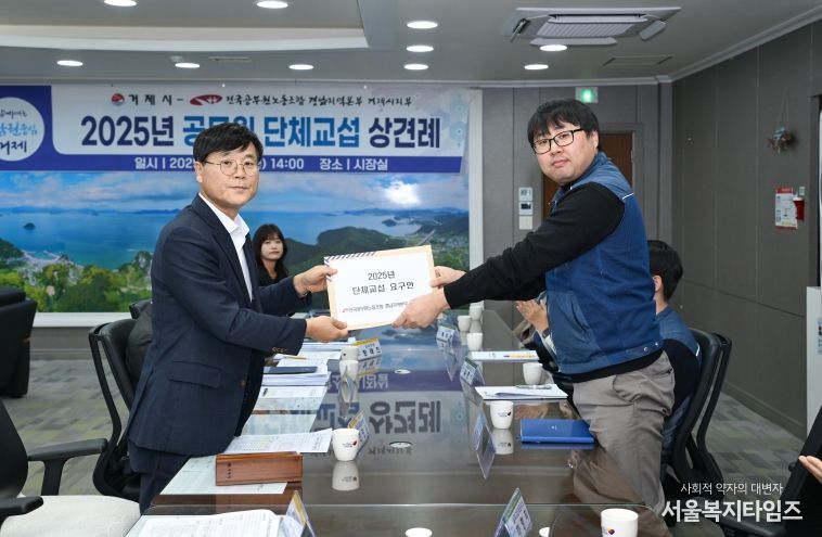 서울복지타임즈 이재연 기자 | 거제시는 26일 시장실에서 전국공무원노동조합 경남지역본부 거제시지부(지부장 유해길)와 2025년 단체교섭을 위한 상견례를 가졌다고 밝혔다.