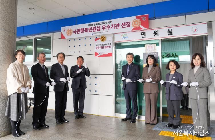 서울복지타임즈 이재연 기자 | 강원특별자치도교육청은 12월 29일, 교육청 민원실 앞에서 ‘2025년 국민행복민원실 인증 현판식’을 열고 행정안전부 장관 기관 포상에 따른 시상금을 사회복지공동모금회에 기부할 계획이라고 밝혔다.