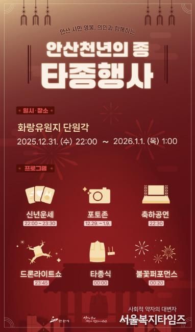 서울복지타임즈 이재연 기자 | 안산시는 오는 31일 오후 10시부터 화랑유원지 단원각에서 ‘2026 안산 천년의 종 타종 행사’를 개최한다고 30일 밝혔다.
