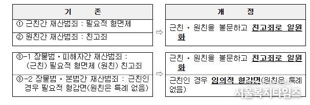 이번 「형법」 개정안에 따르면, ① 친족의 범위를 불문하고 친족간 재산 범죄는 친고죄로 일치시켜 규정하고, ② 장물범과 본범(예:절도범 등) 사이가 근친인 경우 현행 ‘필요적 감면’에서 ‘임의적 감면’으로 개정하며, ③ 근친・ 원친 여부를 불문하고 친고죄로 개정됨에 따라 「형사소송법」 및 「군사법원법」상 고소 제한 규정의 특례를 마련하여 자기・배우자의 직계존속에 대하여도 고소를 할 수 있도록 했다.