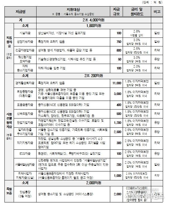 자금 유형별로는 ▴중소기업육성기금 재원으로 융자해 주는 ‘직접 융자금(고정금리)’ 1,800억 원 ▴시중은행 재원으로 자금을 융자, 대출금리 이자 일부를 서울시가 보전하는 ‘시중은행 협력자금(변동금리, 이자차액보전)’ 2조 200억 원 ▴마이너스통장 방식의 ‘안심통장(특별보증)’ 2,000억 원을 각각 공급한다.