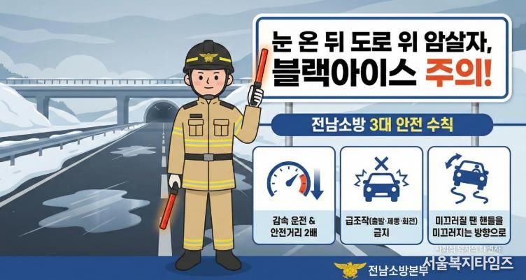 서울복지타임즈 이재연 기자 | 전라남도 소방본부는 오늘(2일) 도내 전역에 내린 많은 눈으로 인해 도로 곳곳에 '블랙아이스(Black Ice)'가 형성될 우려가 높다며, 운전자들의 각별한 주의를 당부했다.