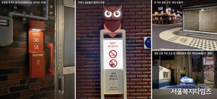 상업 시설로 오인돼 반복적으로 발생하던 주거지 무단침입을 예방하고 주민의 사생활을 보호하기 위해 범죄신고 정보무늬(QR코드)가 부착된 조명형 주거지 표식을 설치했다. 상점 주변에서 발생하는 소음·흡연 문제 개선을 위해서는 ‘부엉이 공공질서 알리미 조명’과 ‘트라이비전 기술 활용 공공질서 표시등’을 도입했다.