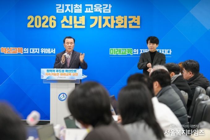 서울복지타임즈 이재연 기자 | 김지철 충남교육감은 8일, 도교육청 회의실에서 ‘2026 신년 기자회견’을 열고, ‘2025년 주요 성과와 2026년 12대 중점 추진 과제’를 발표했다.