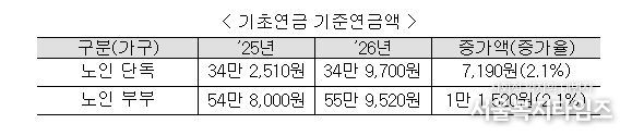 한편, 기초연금 기준연금액 역시 기초연금법에 따라 전년도 소비자물가상승률 2.1%를 반영하여, 2025년 34만 2,510원에서 2026년 34만 9,700원으로 늘어난다. 올해 기초연금을 받는 약 779만 명의 어르신들은 1월부터 인상된 기초연금액을 지급받게 되며, 기초연금 기준연금액의 인상을 위해 관련 고시를 1월 중 개정할 계획이다.